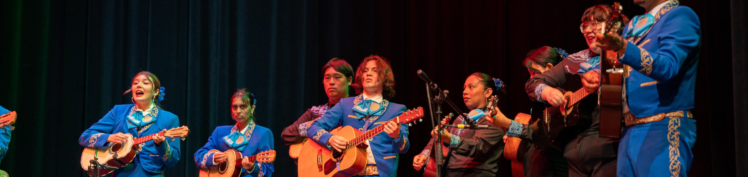 This curriculum features a unique twin-course structure in which music and dance move on parallel tracks to facilitate joint rehearsals and creative activity. Students can take beginning or intermediate classes in Mexican Folkloric Ensemble (MUS 175), taught by Cynthia Reifler Flores, coordinated with beginning through advanced classes in Dance of Mexico (MUS 073), taught by John Avalos. The music ensemble has a broad repertoire embracing not only mariachi but also other regional styles, including Norteño, Jarocho, and Huasteco. Dancers explore traditional Mexican styles as well as the Chicano experience—for example, Zoot Suit Boogie Woogie!—and themes focusing on pre-Hispanic, Indigenous, and Afro-Indigenous roots.